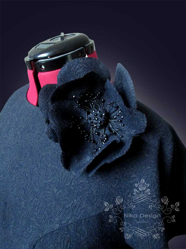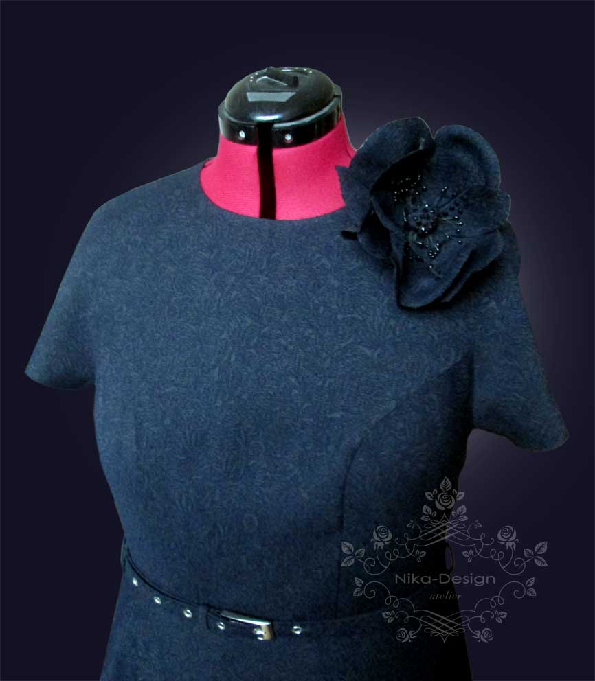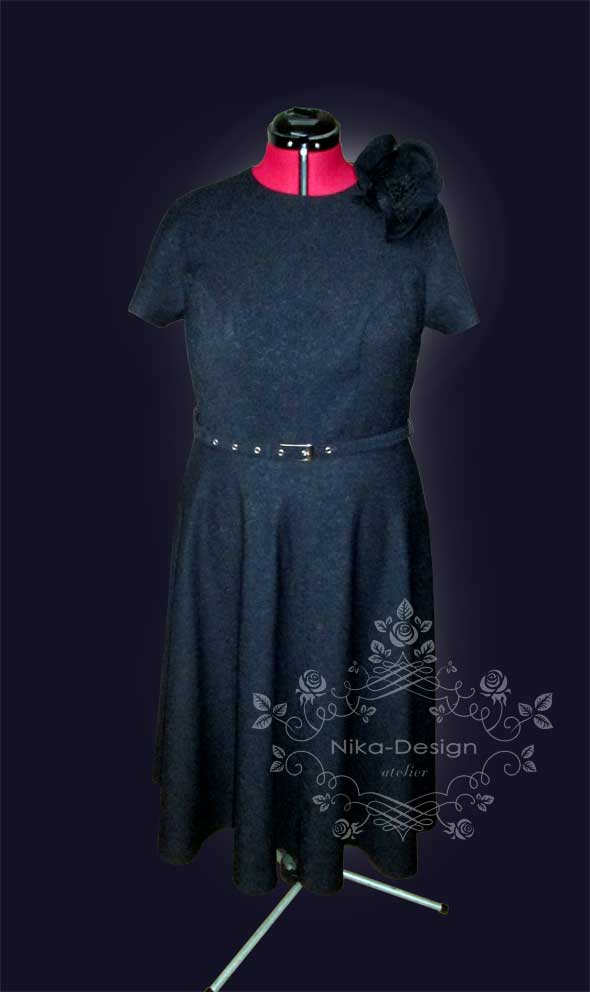 Платье с цельнокроенным рукавом, отрезное по линии талии, с юбкой "полусолнце". Дополнение к платью - тонкий поясок и брошь-цветок.