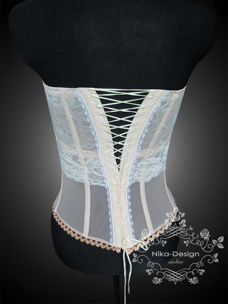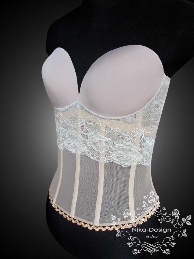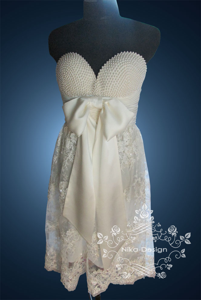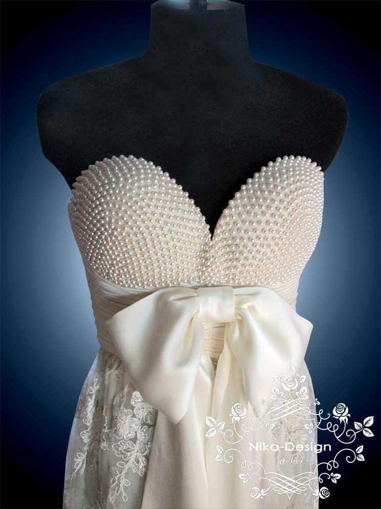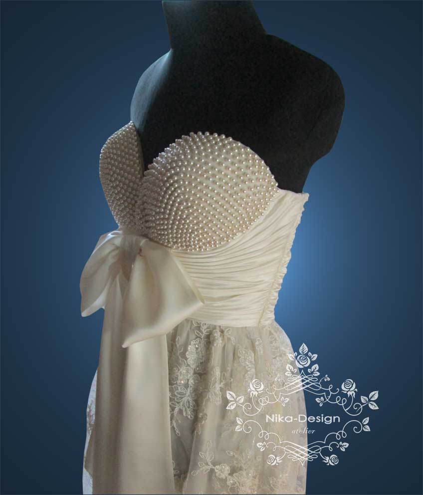 Коктейльное платье, низ из кружева расшитого стеклярусом, лиф из шелка. Чашечки расшиты иск. жемчугом Сваровски ( 1 тыс. жемчужин). Платье одевается поверх тоненького корсета, который был изготовлен нами для этого платья.