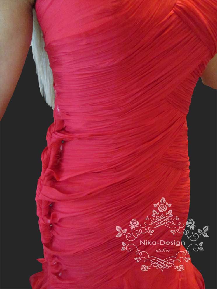 Платье нужно было подогнать по размерам девушки в области бедер, сохранив правильность укладки мелкиих складок драпировки. Еще передвинула бретель с центра спинки на бок - по желанию заказчицы. И конечно же отпарили наряд, т.к. в домашних условия это сделать сложно.
