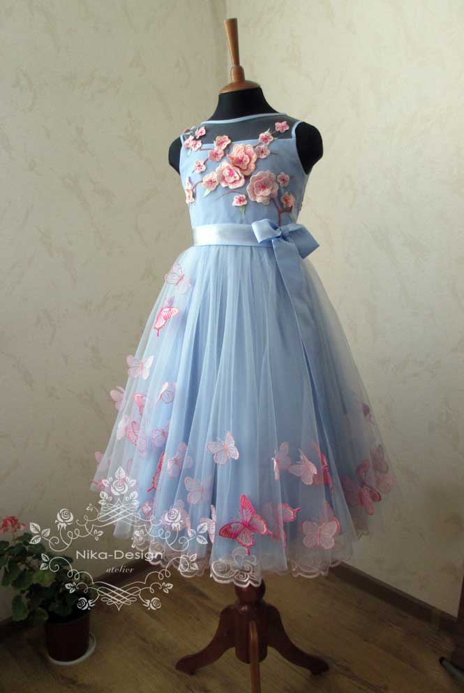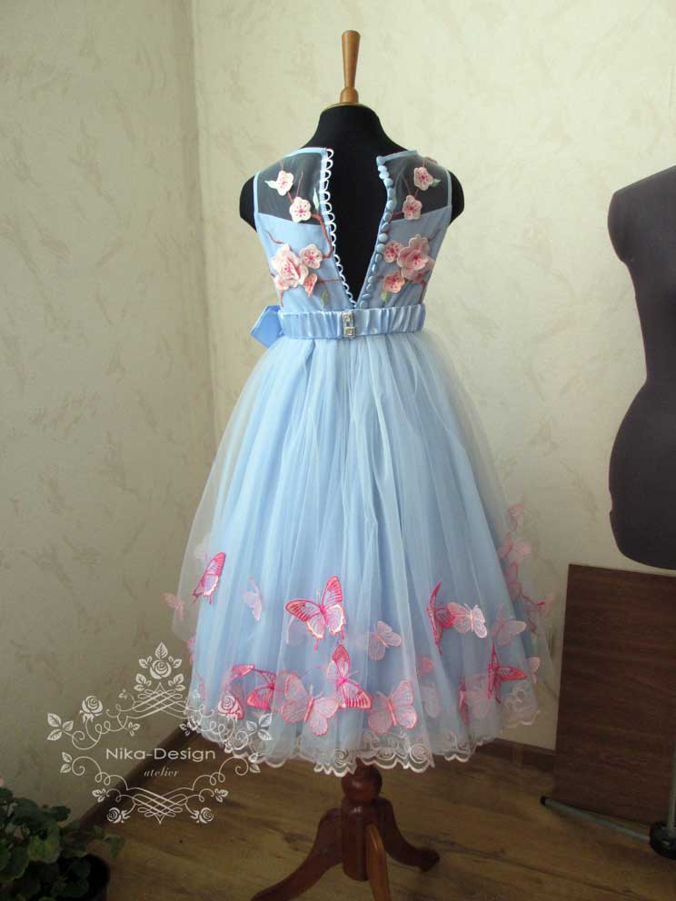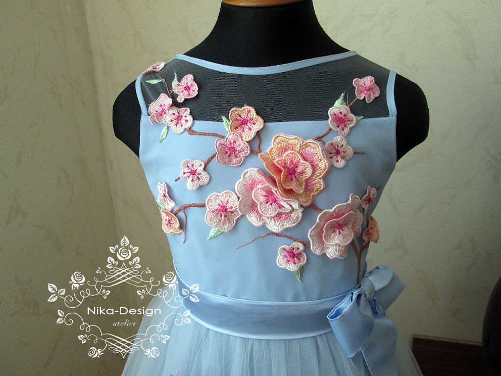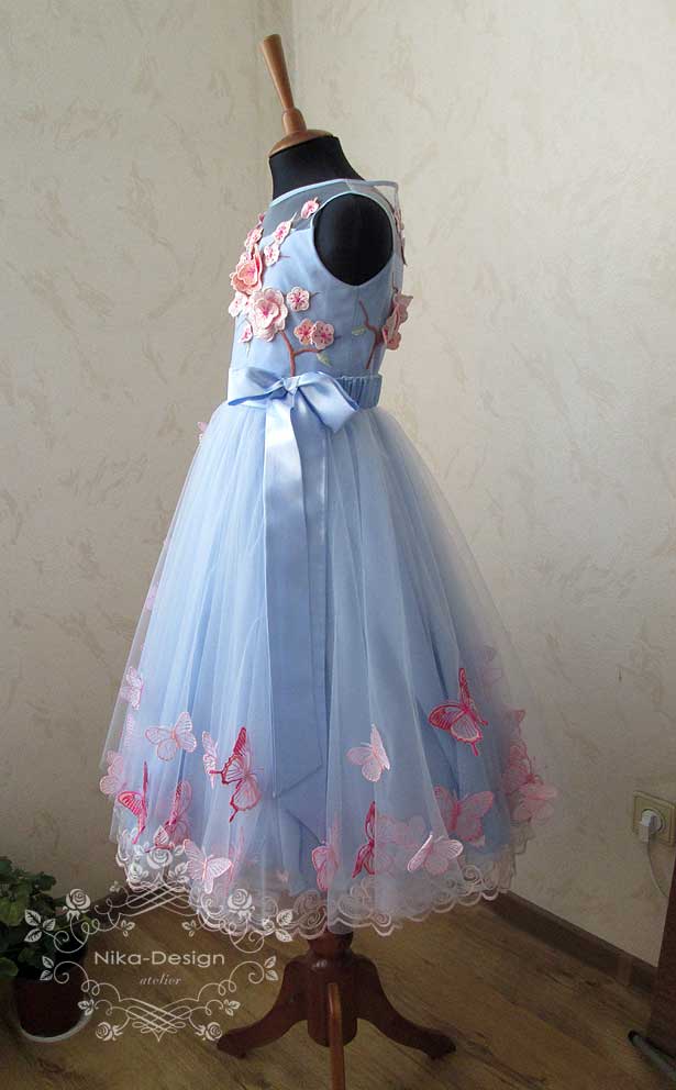 Платье изготовлено: верхний слой лифа и верхние две юбки - из евросетки; сдующие две юбки - из шифона и подкладка из вискозы. Для большей пышности платья пошит подъюбник.