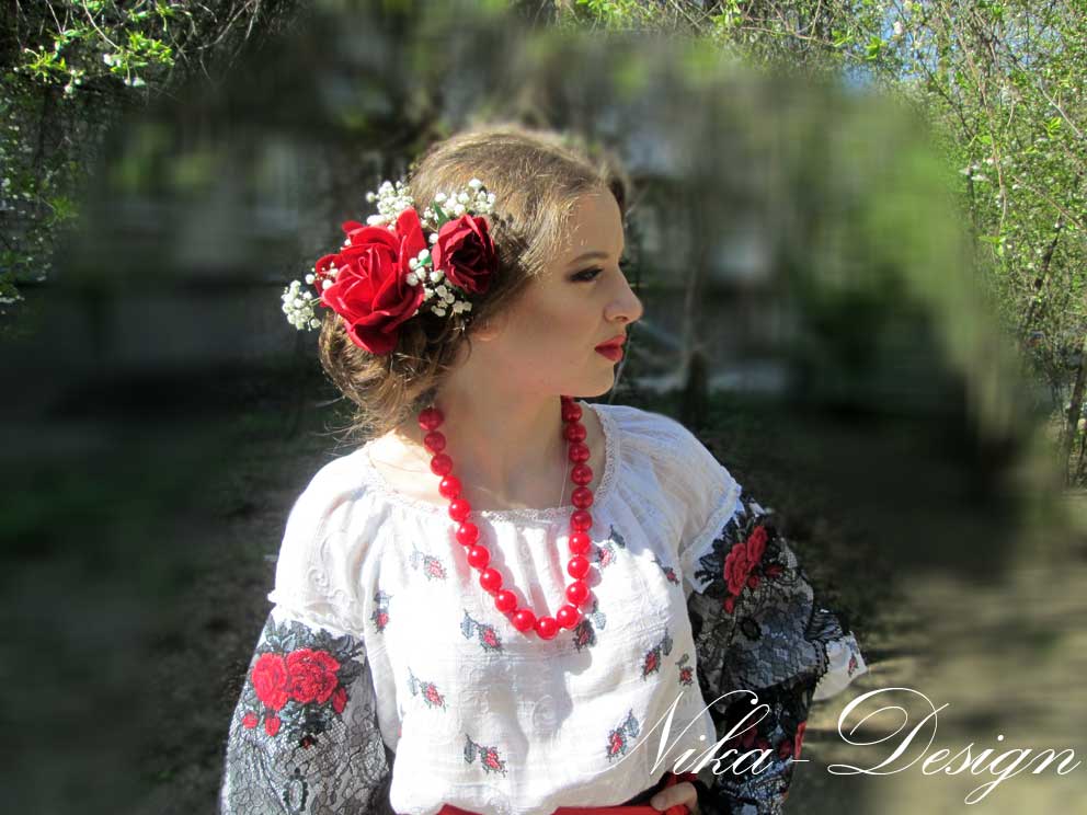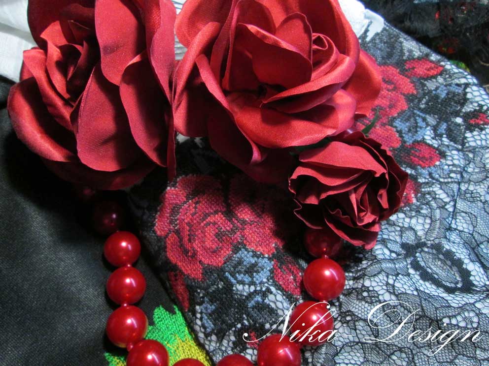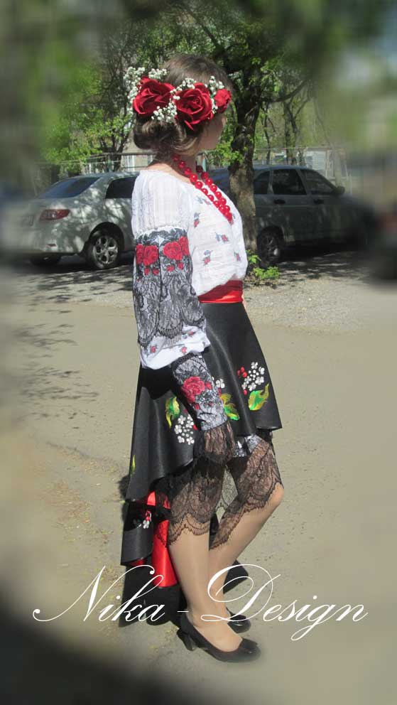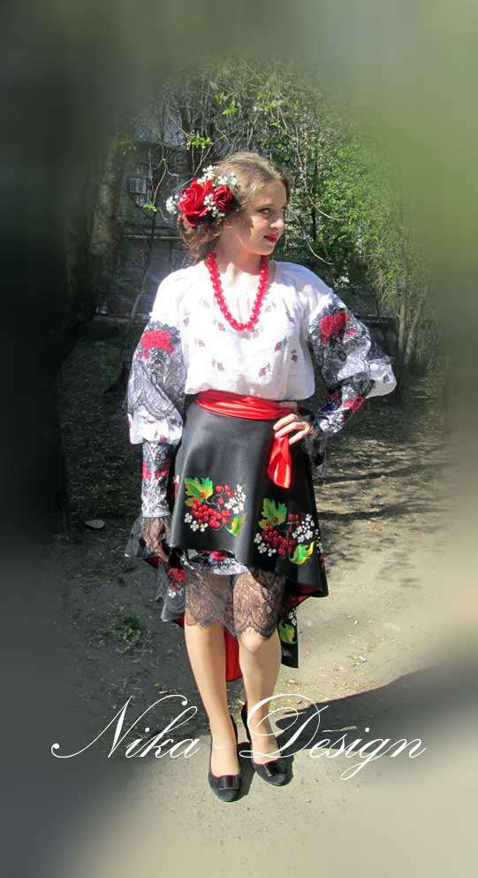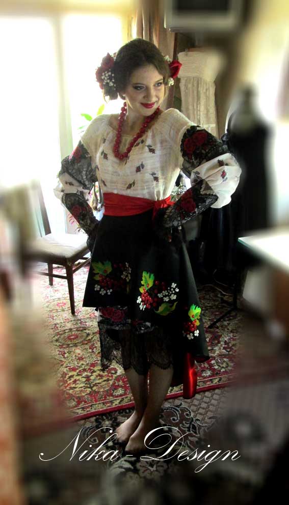 Уже стало традицией - на всех украинских конкурсах вокалистов исполнять песни на украинском языке. Поэтому пришлось шить костюм для выступлений в национальном украинском стиле. Традиционную вышиванку решили декорировать кружевом, поверх которого сделали машинную вышивку "крестиком". Вышиванка из льна и батиста. Юбка из х/б на красной атласной подкладке, украшена машинной вышивкой - гроздья калины (авторский дизайн). Завершает композицию цветы - в прическе атласные розы ручной работы.