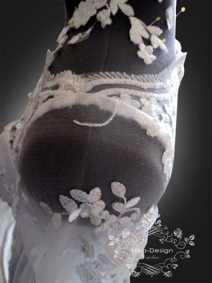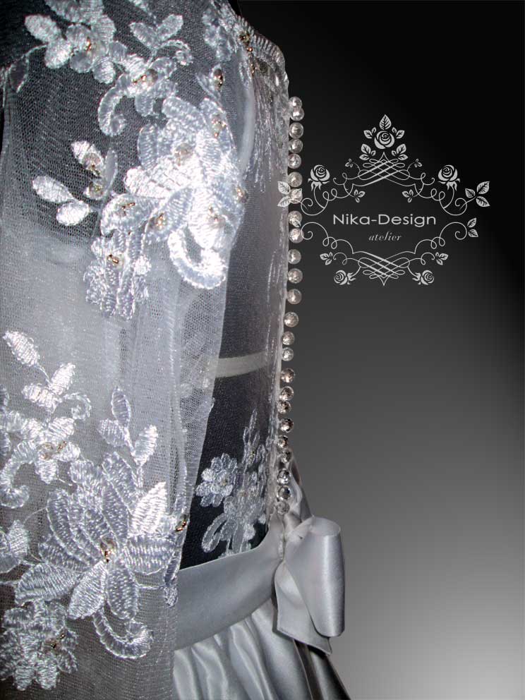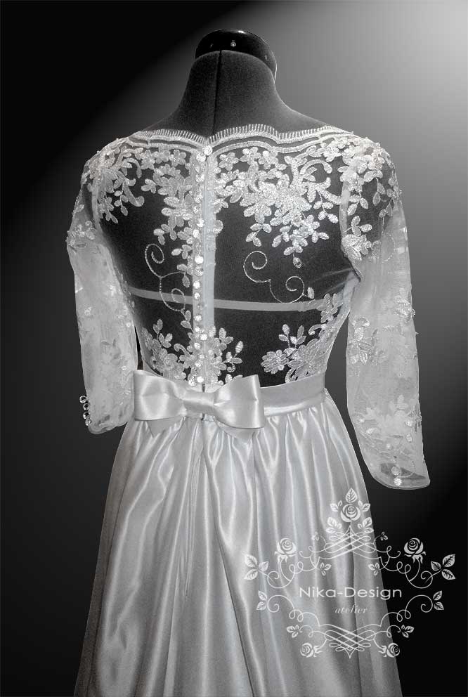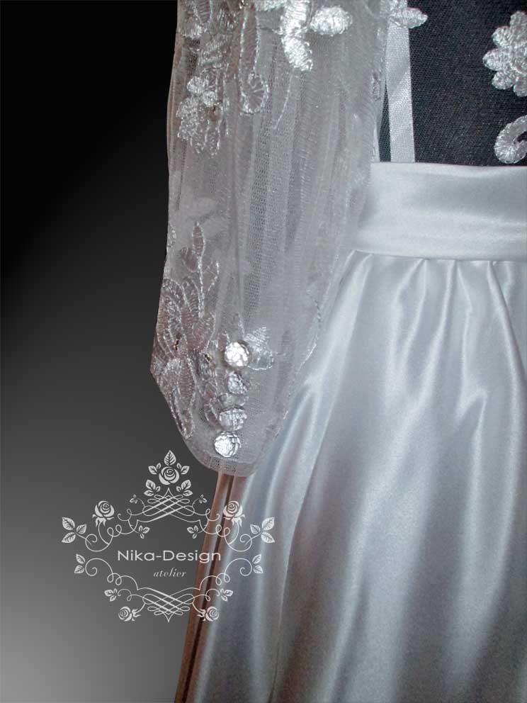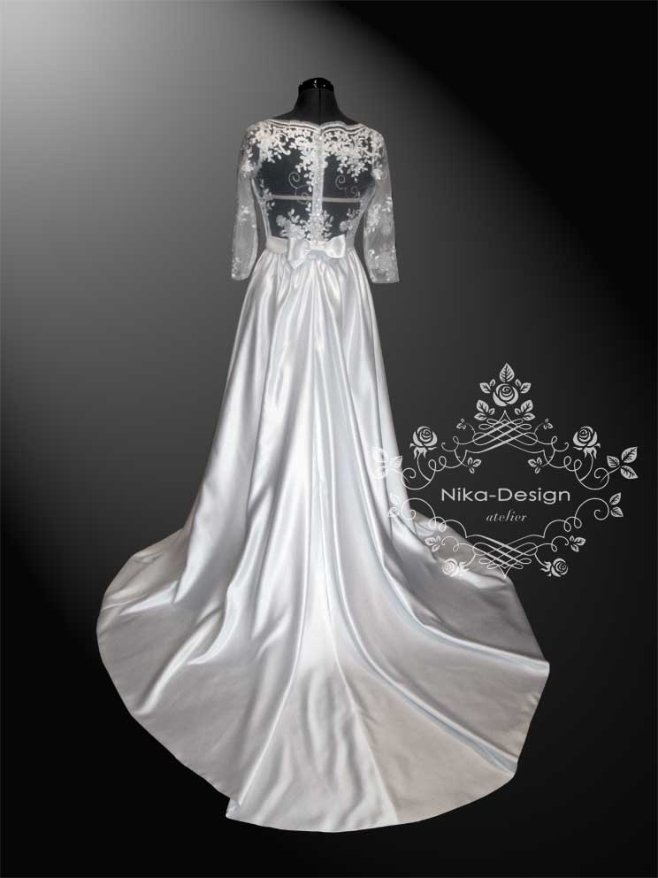 Показываю вам первое платье, лиф которого сделан из кружева, а юбка со шлейфом - из атласа.