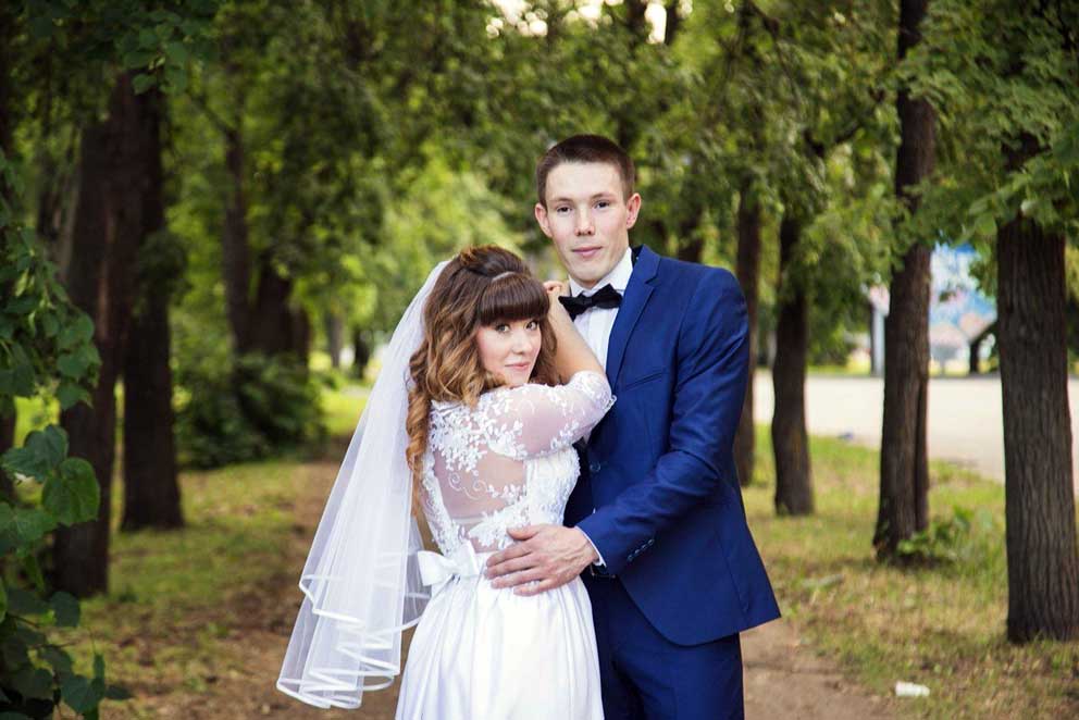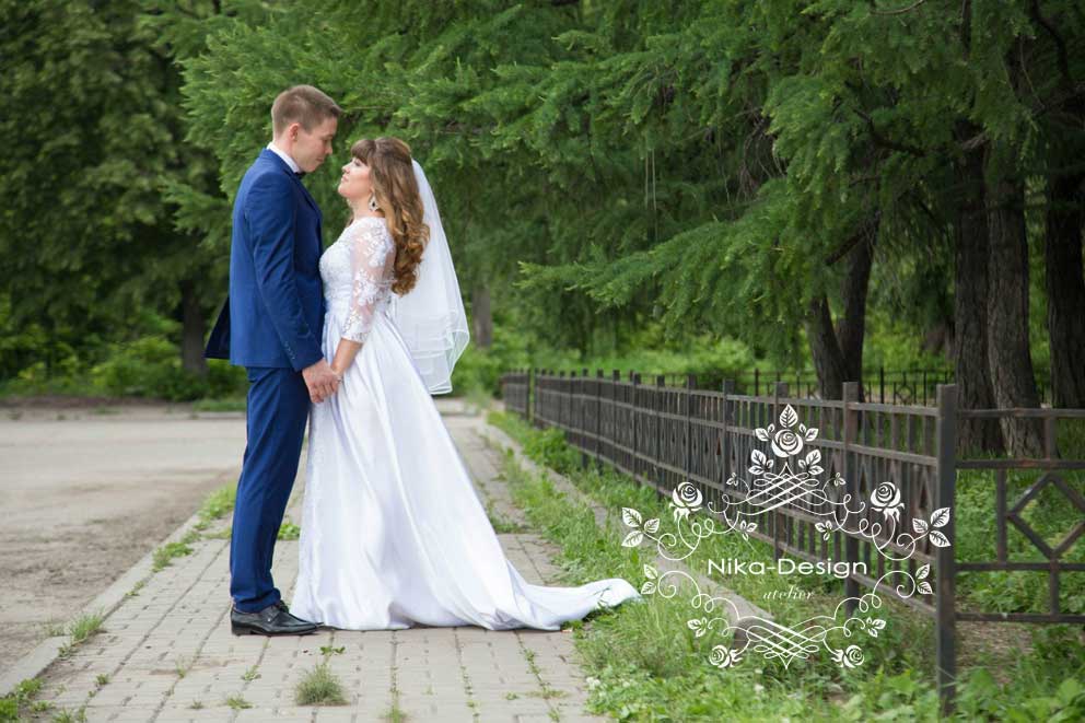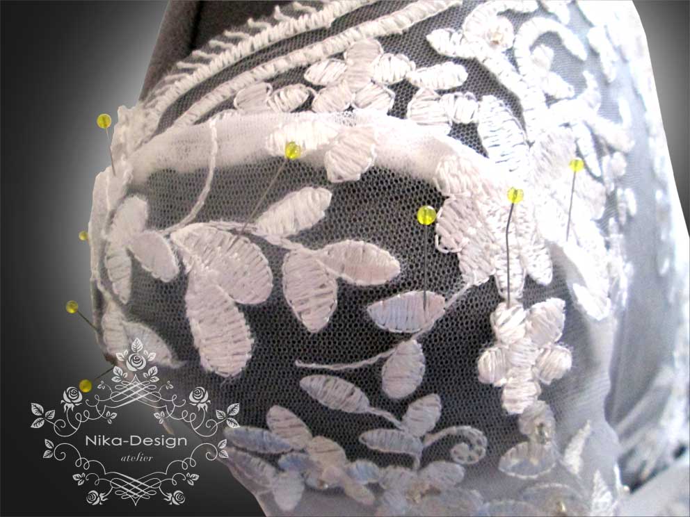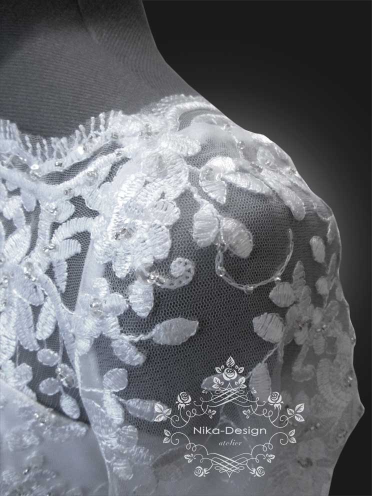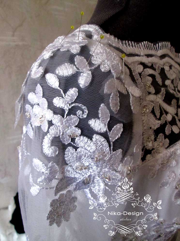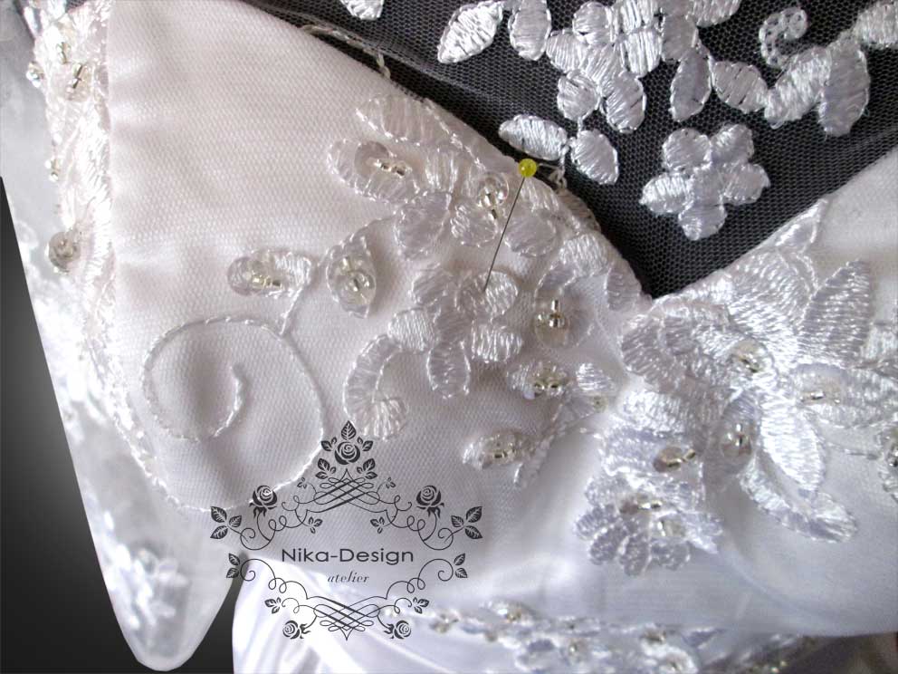 Девушка была очень разочарована своей покупкой, так как платье пришло не такое красивое и качественное, каким оно было на картинке. Рукавчики тесны, в области груди платье велико и некрасиво сидело, обезобразив бюст девушки. Талия в платье не на нужном месте, а горловина не прилегала совсем. Пришлось разобрать наряд, подогнали по размеру его верх, за счет маленьких вставок под руками расширили рукава в верней части. Затем их укоротили, сделав их длиной ¾, а из остатков деталей вырезали кружевные мотивы и украсили ими рукава по окату, заполнив пустоты. После перекроя полочки и спинки верха платья, из кружевных остатков вырезали рисунки цветов и листьев, которыми потом расшили бюст наряда. Для красивой посадки лифа на фигуре невесты в платье вставили чашечки нужного размера. Исправили линию горловины. Сделали пояс с бантиком, добавили элемент регулировки длины шлейфа, украсили платье по спинке и рукавам хрустальными пуговками, а все нашитые кружевные узоры расшили бисером и паетками. Невеста была в восторге и торжество состоялось с прекрасным настроением и долгожданной радостью!